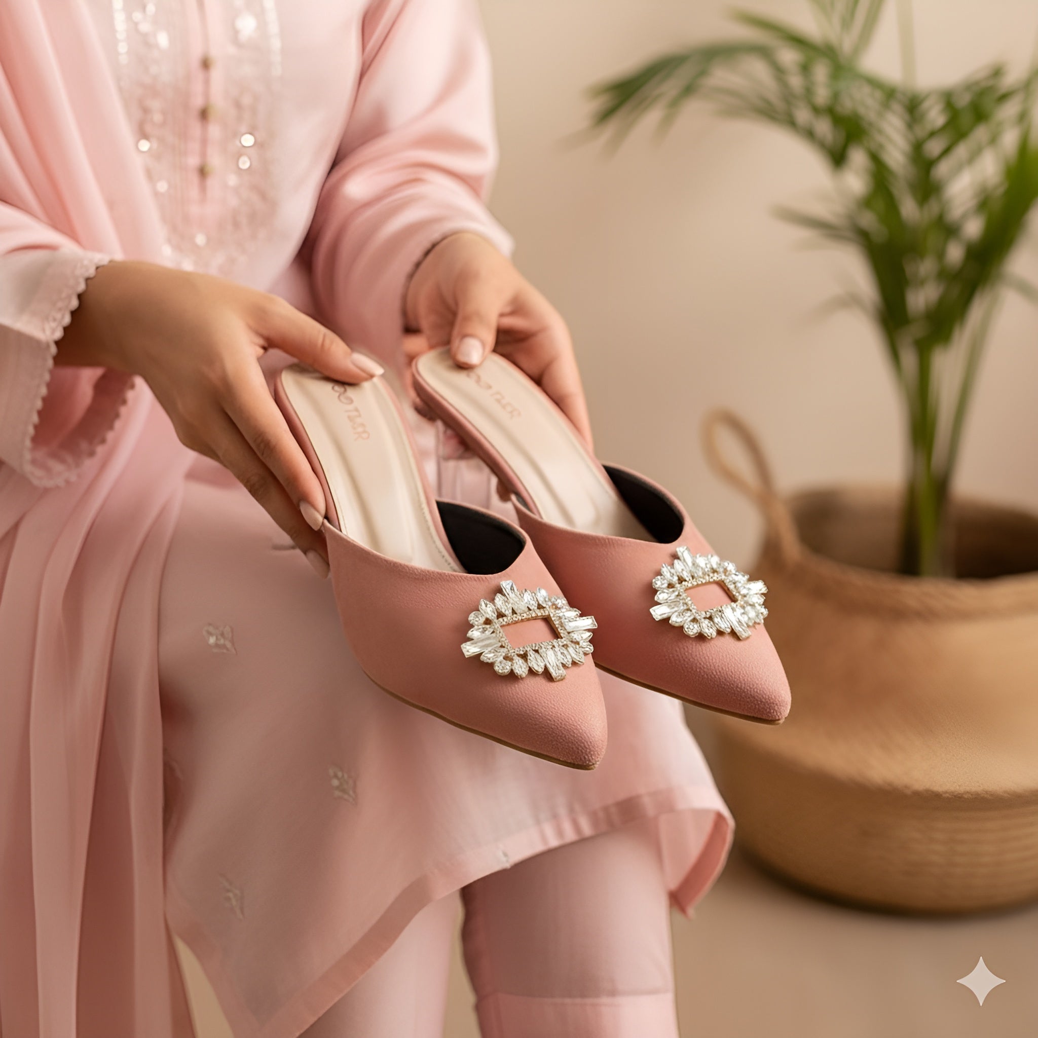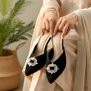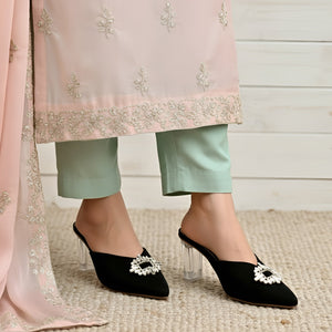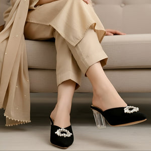 The Broach Transparent Heels showcase a contemporary transparent design, accented by a beautiful brooch. They are ideal for formal events, parties, or casual outings. The transparent heel creates an illusion of height while adding a sleek touch to your outfit.