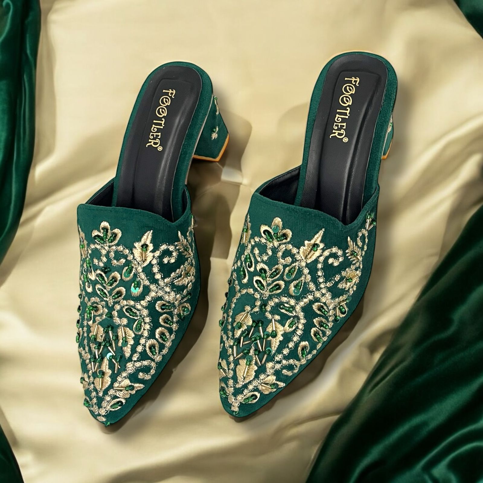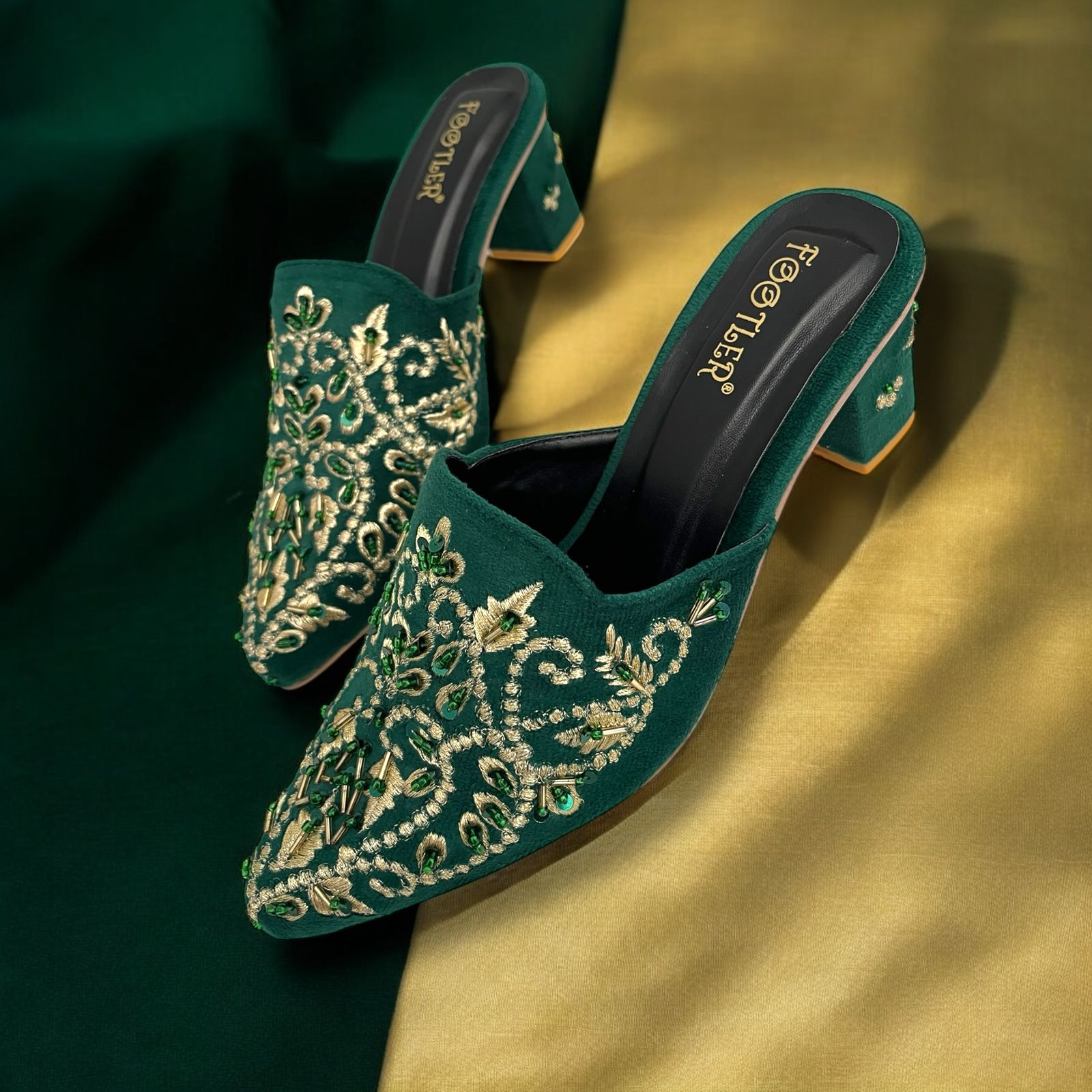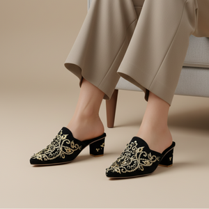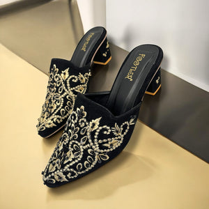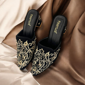 Step into luxurious elegance with Embro Luxe by Footler where opulent design meets comfort in every stitch. These embroidered velvet heeled mules are crafted for those who love to shine. Featuring intricate bead and threadwork on a rich velvet upper, they offer a regal aesthetic, perfect for weddings, festive occasions, or any event where style matters.