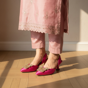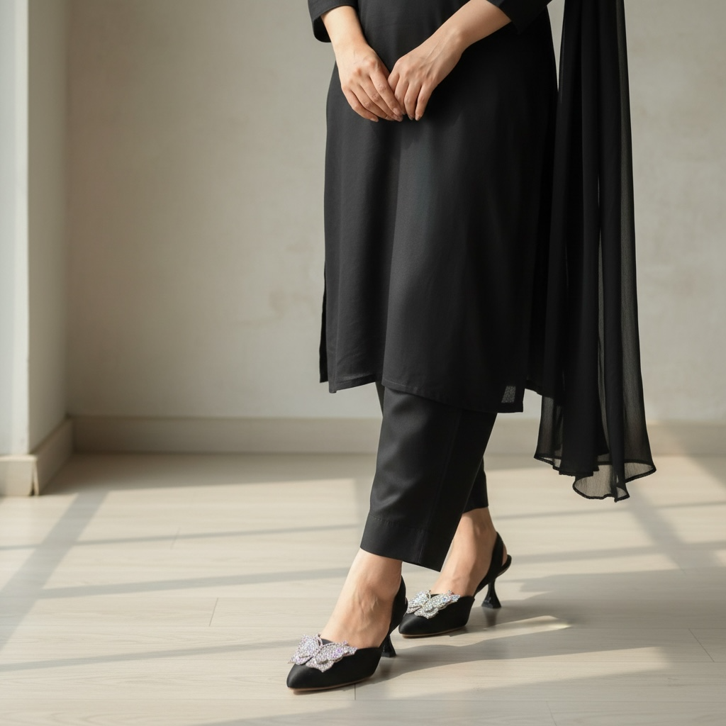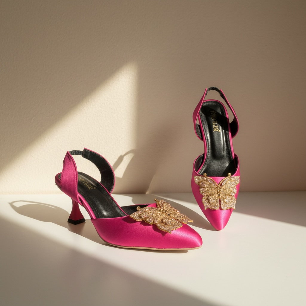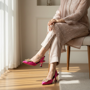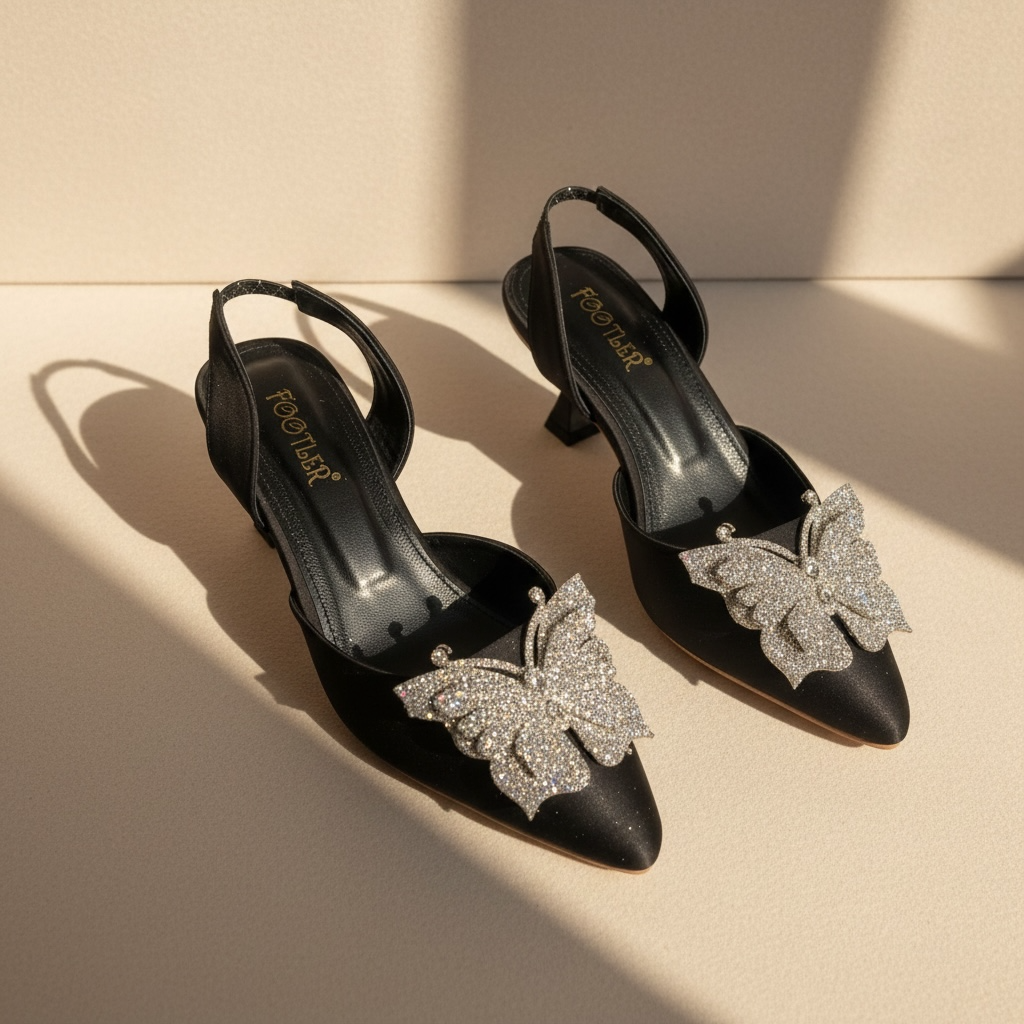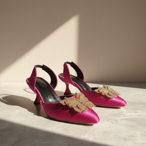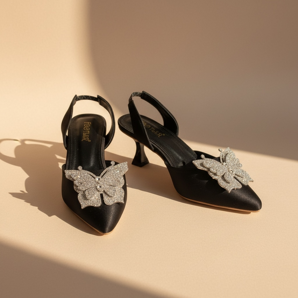 Featuring a sleek pointed-toe silhouette and a delicately crafted butterfly embellishment, these heels reflect sophistication with a modern eastern touch. The balanced heel height and secure back strap provide comfort and confidence, making them suitable for extended wear.