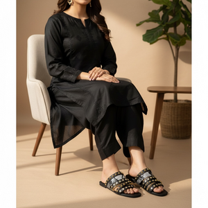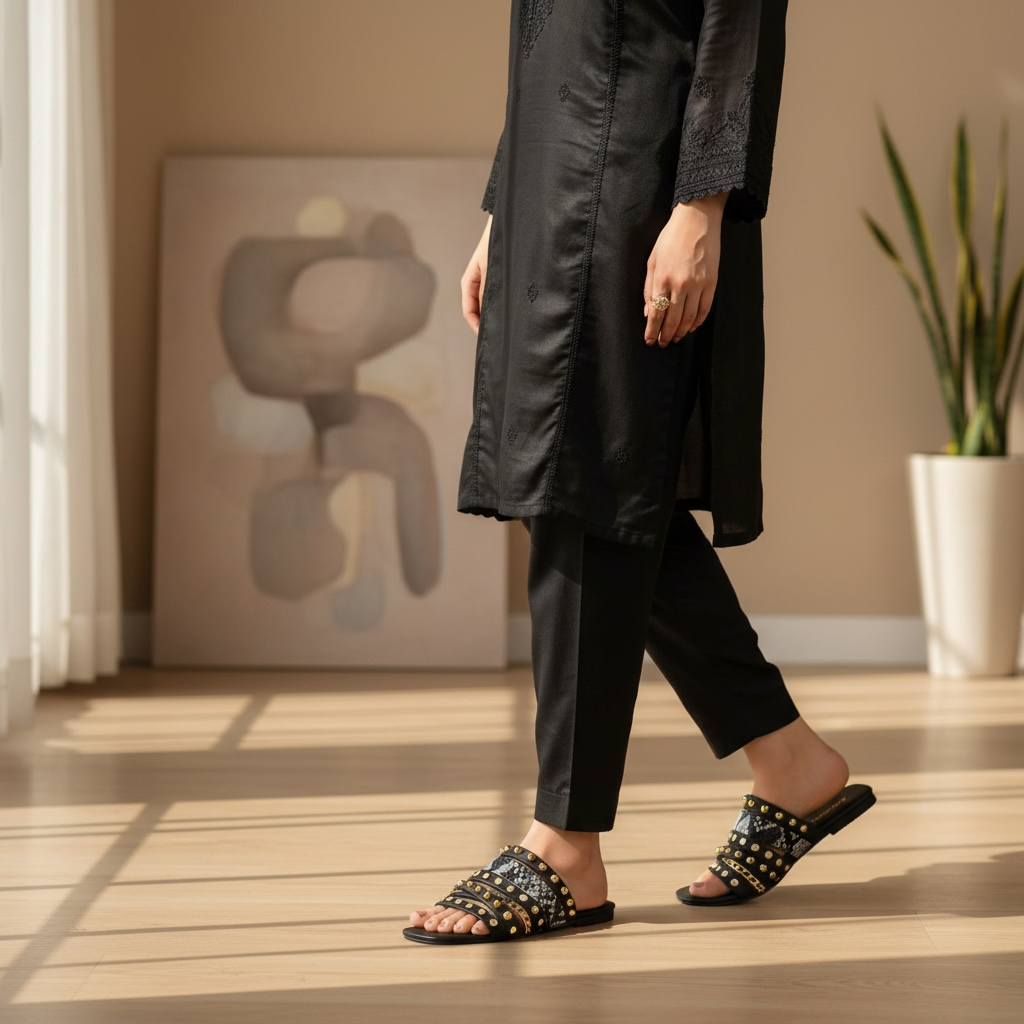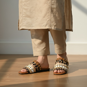 Step into bold elegance with these multi-strap studded flats, designed to bring a perfect blend of comfort, confidence, and chic style. Featuring premium-quality straps, accented with gold-tone studs and a statement leopard print, these slides add an instant pop to any outfit. The soft footbed ensures all-day comfort, while the flat sole offers effortless wearability—ideal for everyday fashion, casual outings, or dressing up a minimal look.