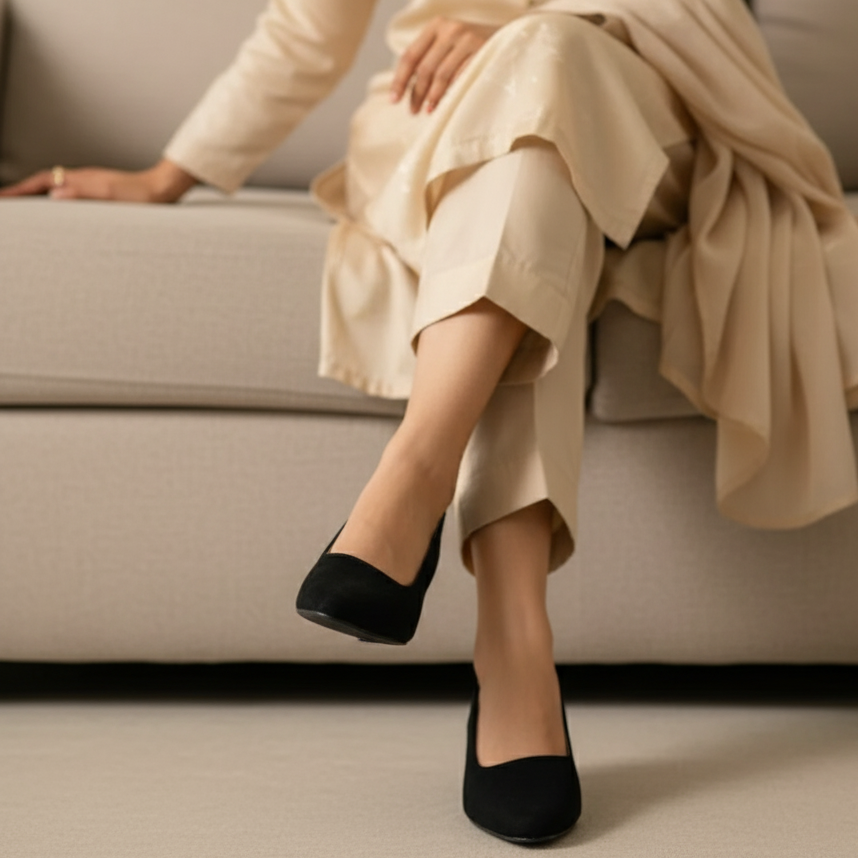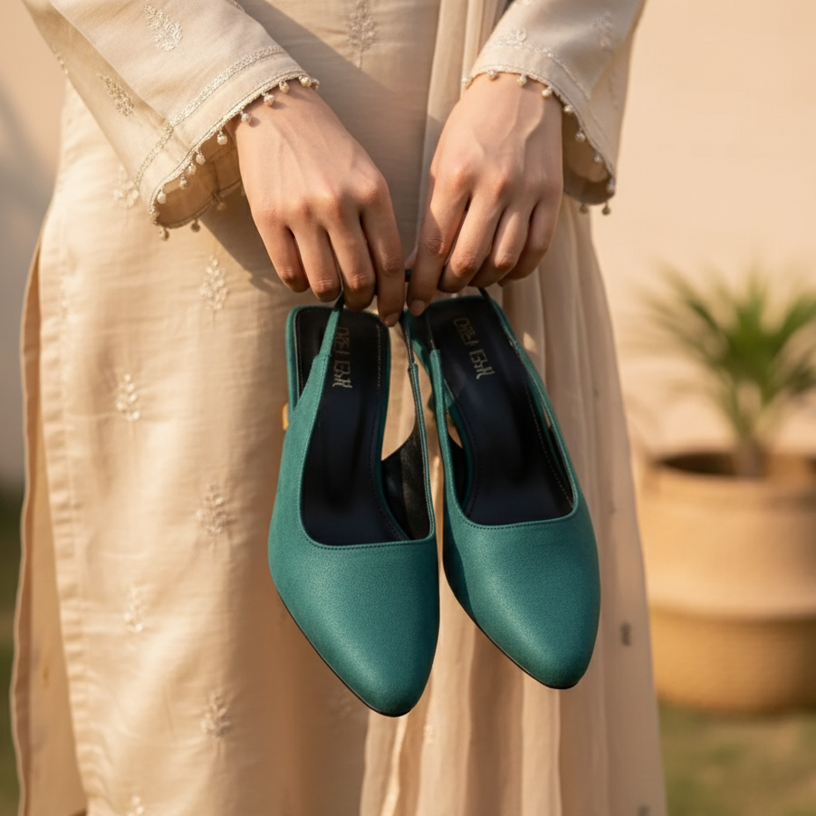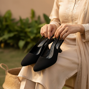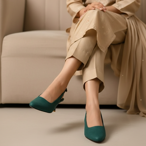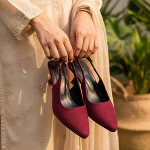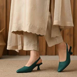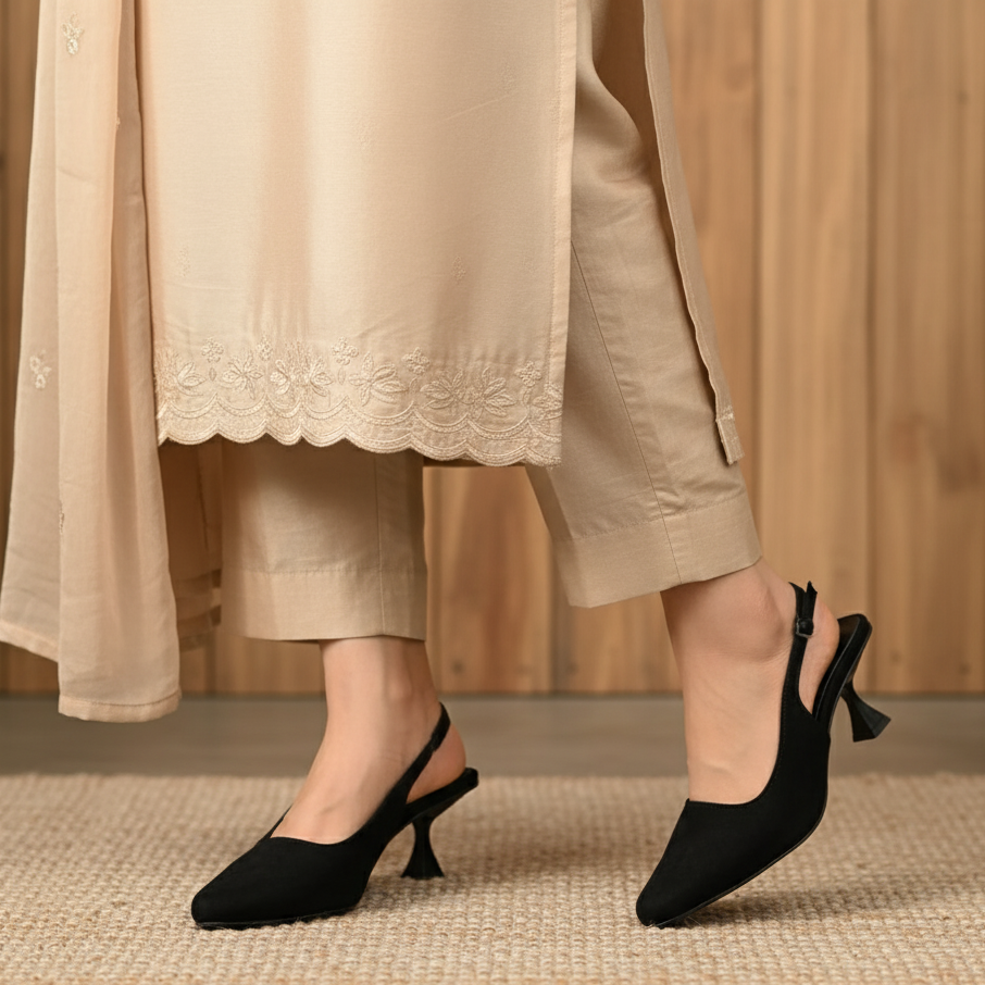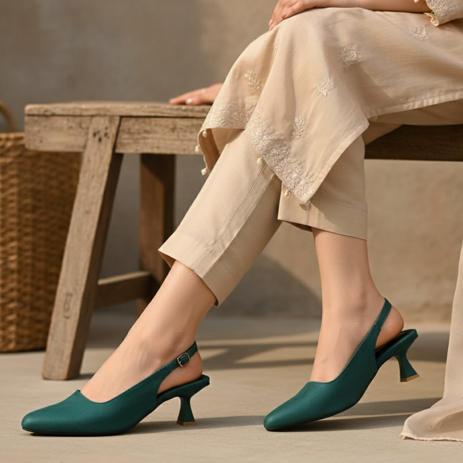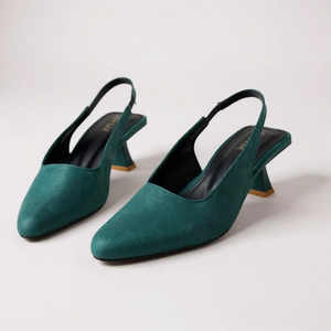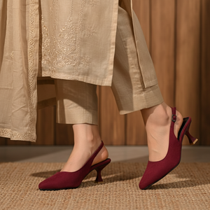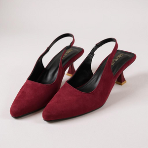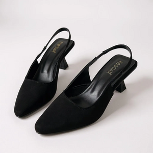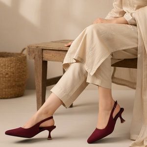 Step into refined elegance with Noir Grace Slingbacks by Footler a graceful blend of style, sophistication, and comfort. These slingback heels are crafted with a luxurious suede finish, featuring a pointed toe silhouette and a distinctive flared block heel that transitions effortlessly from daywear to evening glam. Available in rich colors like maroon, black, and green, they elevate any ensemble from formal dresses to chic trousers.