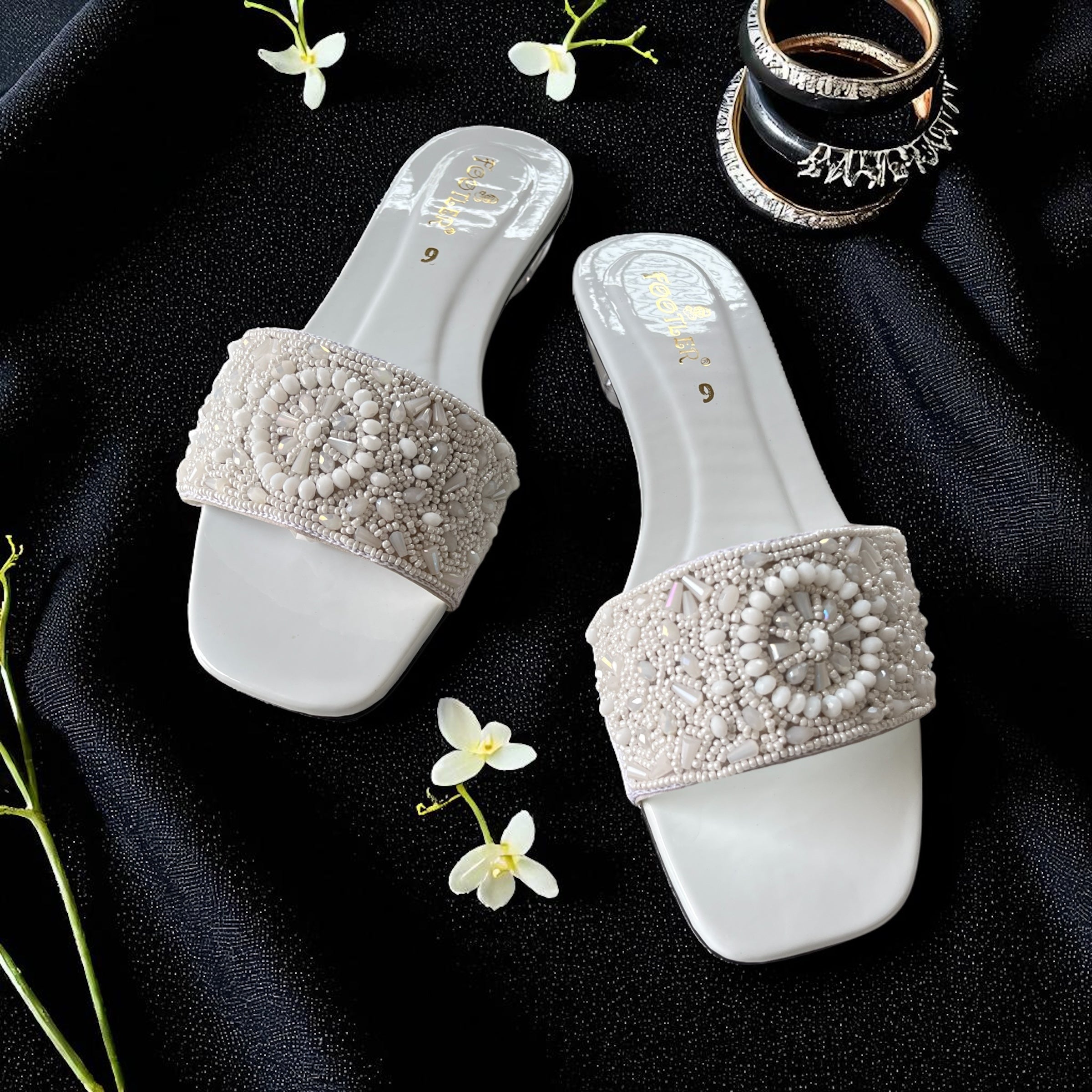 The mirror work adds a gentle shine, making it a versatile choice for every wardrobe. It pairs beautifully with eastern wear or semi-formal outfits, giving a graceful finish to your look. Available in multiple sizes, this pair offers a comfortable fit for all-day wear.
